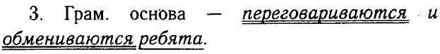 4. Простое, двусоставное, распространённое, осложнено однородными членами. 5. Члены предложения: а) подлежащее — ребята, сущ., одуш., мн. ч., им. п.; б) сказуемое — переговариваются (глаг., возврат., изъяв, накл., наст, вр., мн. ч.); обмениваются (глаг., возврат., изъяв, накл., наст, вр., мн. ч.); в) обстоятельства — около входа (сущ. с предлогом, неодуш., м. р., ед. ч., р. п.); шумно (нареч., неизм.); г) дополнение — новостями, сущ., 3-е скл., неодуш., ж. р., мн. ч., т. п. д) определение — отдохнувшие в выходные прич. об. Упр. 181
