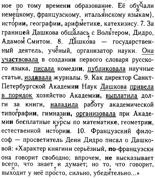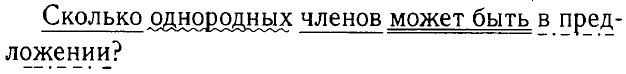 1. Повествовательное. 2. Невосклицательное. 3. Грамм, основа — обучали, односоставное. 4. Распространённое, осложнено однородными членами предложения (определениями и дополнениями). 5. Члены предложения: а) главный член предложения — обучали, глаг., неперех., невозврат., изъяв, накл., прош. вр., мн. ч. б) дополнения — её (мест., личн., ж. р., ед. ч., 3-е л.); языкам (сущ., неодуш., нариц., м. р., 2-е скл., т. п., мн. ч.); истории (сущ., неодуш., нариц., ж. р., 1-е скл., т. п., ед. ч.); географии (сущ., неодуш., нариц., ж. р., 1-е скл., т. п., ед. ч.); арифметике (сущ., неодуш., нариц., ж. р., 1-е скл., т. п., ед. ч.); катехизису (сущ., неодуш., нариц., 2-е скл., м. р., т. п., ед. ч). в) определения — немецкому (прил., относит., т. п., ед. ч.); французскому (прил., относит., т. п., ед. ч.); итальянскому (прил., относит., т. п., ед. ч). Упр. 236 Сколько однородных членов может быть в предложении? Очевидно, столько, сколько предметов, признаков, явлений и т. п. объединено в класс, группу по сходству или различию. Например, в «Обратном словаре русского языка» среди 125 тысяч слов содержится 56332 имени существительного. Допустим, мы бы начали предложение так: «Именами существительными являются...», а затем стали бы перечислять все 56332 существительных. Теоретически предложение с таким количеством однородных членов возможно. Практически же количество однородных членов в речи колеблется от двух до девяти. Это определяется особенностью человеческой памяти. Объём кратковременной памяти характеризуется ограниченным временем хранения информации (до 30 секунд) и ограниченным количеством удерживаемых элементов (7 ±2). Отсюда и ограничение в речи количества однородных членов. Другое дело — долговременная память, объём информации и длительность хранения в которой не ограничены. Основная мысль текста. Теоретически можно использовать любое количество однородных членов, однако это невозможно по причине ограниченной памяти человека. Синтаксический разбор предложения