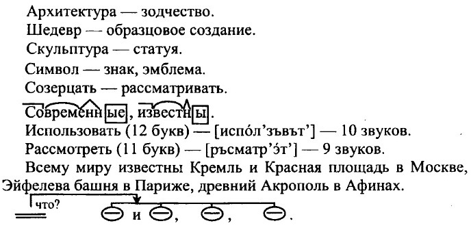 Повторение. ГДЗ по русскому языку за 8 классУпр. 400 (401). Архитектура — это строительное искусство, умение проектировать и создавать города, жилые дома, площади, улицы, сады и парки. Во многих городах нашей страны вы встретите древние кремли и церкви, дворцы и особняки, современные здания, перед которыми захочется остановиться и повнимательнее их рассмотреть. Так же вы стояли бы в музее перед интересной картиной и скульптурой. Это потому, что здания и улицы, площади и парки, комнаты и залы своей красотой тоже могут волновать воображение и чувства человека, как и другие произведения искусства. Шедевры архитектуры запоминаются как символы народов и стран. Всему миру известны Кремль и Красная площадь в Москве, Эйфелева башня в Париже, древний Акрополь в Афинах. Однако, в отличие от других искусств, произведения архитектуры можно не только созерцать, но и использовать.