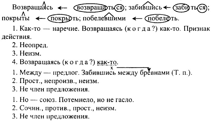 Упр. 402 (403). Однажды в доме появился еще один обитатель. Вот как это произошло. Возвращаясь как-то с дежурства, доктор увидел слепого пса. С обрывком веревки на шее, он сидел, забившись между бревнами, и дрожал. Доктор и раньше несколько раз видел его. Теперь он остановился, рассмотрел его во всех подробностях, почмокал губами, посвистал, потом взялся за веревку и потащил слепого к себе домой. Дома доктор вымыл его теплой водой с мылом и накормил. По привычке пес вздрагивал и поджимался во время еды. Ел он жадно, спешил, давился. Лоб и уши его были покрыты побелевшими рубцами. «Ну, теперь ступай», — сказал доктор, когда пес наелся и подтолкнул его с террасы. Пес уперся и задрожал. «Гм...» — произнес доктор и сел в качалку. Наступал вечер, небо потемнело, но не гасло совсем. Загорелись самые крупные звезды. Гончий пес улегся на террасе и задремал.