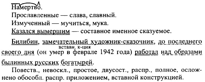 Упр. 405 (406). Город казался вымершим, пустынные улицы замело снегом, холодные громады домов зияли ранами, безжизненно повисли сорванные провода, троллейбусы намертво вмерзли в сугробы. Но раненый, измученный город продолжал жить творческой жизнью: в осужденном городе Шостакович написал свою знаменитую симфонию, названную «Ленинградской», в подвалах Эрмитажа работали прославленные художники, архитекторы, ученые, отказавшиеся, несмотря на преклонный возраст и гаснущее здоровье, уехать из Ленинграда. Билибин, замечательный художник-сказочник, до последнего своего дня (он умер в феврале 1942 года) работал над образами былинных русских богатырей. На все предложения уехать старый художник неизменно отвечал: «Из осажденной крепости не бегут, а обороняются».