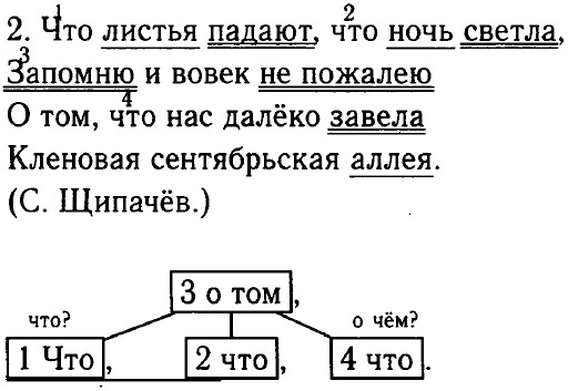 Упр. 168 — устно. Упр. 169 1. ...Нет сомнения, что он [А. С. Пушкин] создал наш поэтический, наш литературный язык и что нам и нашим потомкам останется только идти по пути, проложенному его гением. (Связь между придаточными — однородное соподчинение.) ... Пушкин сам был великолепный русский художник. 2. ... Заслуги Пушкина перед Россией велики и достойны народной признательности. Он [Пушкин] дал окончательную обработку нашему языку, который теперь по своему богатству, силе, логике и красоте формы признаётся даже иностранными филологами едва ли не первым после древнегреческого; он отозвался типическими образами, бессмертными звуками на все веяния русской жизни. (И. Тургенев.) Упр. 170 1. Со своими воспитанниками Арина Родионовна обращалась запросто, называла их «занавесные Пушкенята», потому что, когда они были грудными младенцами, им во время кормления как-то особенно завешивали глаза от света. 2. Привязанность Пушкина к няне так бросалась в глаза, что Анна Керн, в которую Пушкин был так бурно влюблён, уверяла, что Пушкин по-настоящему любил только свою Музу и свою няню. (А. Тыркова-Вильямс.) Упр. 171 Песенка