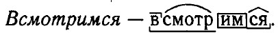 1. В слове всмотримся основа всмотр-, окончание -им-, возвратный постфикс -ся. 2. Основа непроизводная. 3. Родственные слова: смотреть, смотр, осмотр, просмотр. Корень — -смотр, приставка -в-, окончание -им-, постфикс -ся. Таким образом, слово состоит из морфем: приставки, корня, окончания, постфикса.