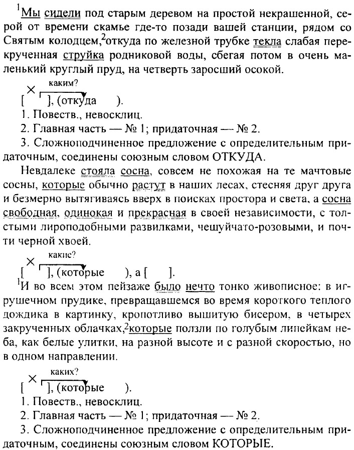 Сложноподчиненное предложение с одной придаточной частью Сложноподчиненное предложение с придаточным определительным. ГДЗ по русскому языкуУпр. 125 (107). 1) В полдень на берегу реки, которая протекает вдоль луга, можно наблюдать интересную картину. 2) Коровы, которые уже подоены, ложатся спокойно спать. 3) Коровы, которые пасутся на лугу, ждут своих доярок. 4) Сняв шапку, которая была сильно поношена и забрызгана грязью, гость протянул хозяину руку. Упр. 126 (108). 1) На автобусной остановке, находящейся недалеко от нашего дома, я встретил своего товарища, с которым давно не виделся. 2) Вокруг поляны, на которой мы поставили палатки, растут березы, уже начавшие желтеть. 3) Туман, затянувший все вокруг, принес собой сырость, которая пропитала нашу одежду. Упр. 127 (109). Мы сидели под старым деревом на простой некрашенной, серой от времени скамье где-то позади вашей станции, рядом со Святым колодцем, откуда по железной трубке текла слабая перекрученная струйка родниковой воды, сбегая потом в очень маленький круглый пруд, на четверть заросший осокой. Невдалеке стояла сосна, совсем не похожая на те мачтовые сосны, которые обычно растут в наших лесах, стесняя друг друга и безмерно вытягиваясь вверх в поисках простора и света, а сосна свободная, одинокая и прекрасная в своей независимости, с толстыми лироподобными развилками, чешуйчато-розовыми, и почти черной хвоей. И во всем этом пейзаже было нечто тонко живописное: в игрушечном прудике, превращавшемся во время короткого теплого дождика в картинку, кропотливо вышитую бисером, в четырех закрученных облачках, которые ползли по голубым линейкам неба, как белые улитки, на разной высоте и с разной скоростью, но в одном направлении. (В. Катаев.)