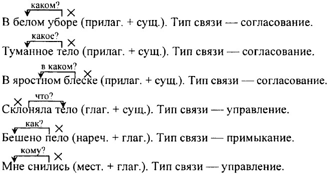 Именные словосочетания: в белом уборе, туманное тело, в яростном блеске. Глагольные словосочетания: склоняла тело, бешено пело, мне снились.