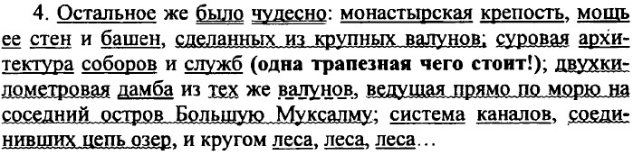 1. Простое 2. Повествовательное 3. Восклицательное 4. Двусоставное, распространенное, полное. 5. Осложнено однородными подлежащими, вставной конструкцией, тремя определениями, выраженными причастными оборотами. Упр. 190 (292). На фотографиях древний ансамбль Кижей кажется игрушечным. Потрясает хрупкость и выверенность каждой деревянной детали. Нельзя не любоваться стройностью и красотой деревянного зодчества, нельзя не гордиться русским мастерами. Купола Покровской церкви будто покрыты деревянной чешуей, даже не дотрагиваясь до них, можно представить их тепло и гладкость. Весь ансамбль - продолжение природы: в нем нет ничего лишнего, ничего противного естеству. В этой гармонии с небом, с лесом, с водой - сила и красота всего истинно русского. Упр. 191 (293). Одесса В мае у меня приключилась необыкновенная, незабываемая поездка в Одессу. Этот город всегда привлекал меня морем, кораблями, особенным одесским говором и юмором... Сначала поезд: за сутки, проведенные на верхней полке, наступила настоящая весна, словно в сказке, голые московские березки превращались в цветущие белые украинские яблони, городские вороны сменялись цаплями, стоящими в воде. Вот и железнодорожный вокзал. Нас встречают и везут по улицам. В городе цветут каштаны и пахнет дождем. Квартира в старом доме: во дворе развешено белье, жмурятся кошки, до третьего этажа поднимаешься по деревянной лестнице... За пять дней успели посмотреть многое: и морвокзал с памятником жене моряка, и песчаные пляжи, и «Аркадию». Пили кофе на Дерибасовской, сидели на тринадцатом стуле, спорили с одесситами, смеялись. И конечно, запоминали смешные названия лавочек и магазинов, фотографировали объявления, написанные фломастером прямо на стене...