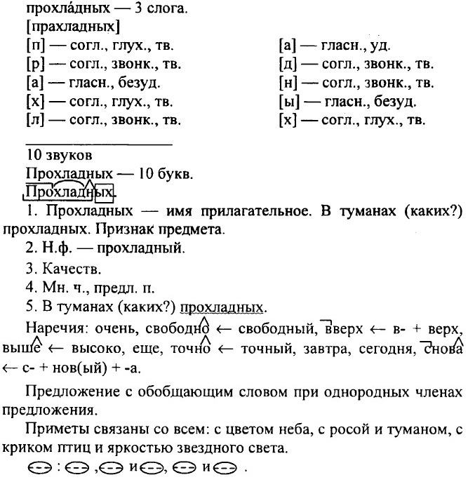 Упр. 312 (321). Чтобы не заблудиться в лесах, надо знать приметы. Находить приметы или создавать их — очень увлекательное занятие. Приметы связаны со всем: с цветом неба, с росой и туманом, с криком птиц и яркостью звездного света. В приметах заключено много точного знания и поэзии. Есть приметы простые и сложные. Самая простая примета — это дым костра. То он подымается столбом к небу, свободно струится вверх, выше самых высоких ив, то стелется туманом по траве, то мечется вокруг огня. И вот к прелести ночного костра и горькому запаху дыма, треску сучьев, перебеганию огня и пушистому белому пеплу присоединяется еще и знание завтрашней погоды. Глядя на дым, можно точно сказать: будет ли завтра дождь, ветер или снова как сегодня солнце подымется в глубокой тишине, в синих прохладных туманах. (К. Паустовский.)