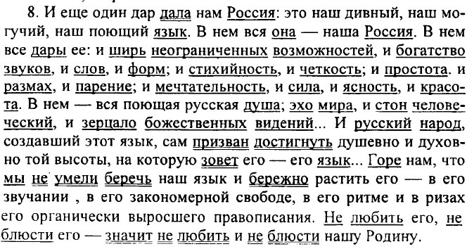 Упр. 313 (322). Согласный, гласный, суффикс, подлежащее, кавычки, переносное значение, прямое значение, фразеологизм, орфограмма, дефис, тире, приставка, орфоэпия, сложение слов, ударег ние, запятая, двоеточие, имя числительное, словосочетание, бессоюзное сложное предложение, деепричастный оборот, фонетическая транскрипция, частица, притяжательное прилагательное, придаточное изъяснительное. Упр. 314 (313). 2. Авторские знаки делают текст нестандартным, запоминающимся, более эмоциональным. 1. Наш дивный русский язык — дар России своим людям; и не жалеть его, не блюсти его — значит не любить и не блюсти нашу родину. 2. Стиль речи — художественный. Стилевые черты — образность, эмоциональность, экспрессивность. 3. Описание и рассуждение. 4. — смысловове богатство лексики (Языку все доступно, он покорен мировому и надмирному, он властен все выразить, изобразить, передать и т.д.) — книжные слова (стихийность, паренье, надмирное, грай, свершение)