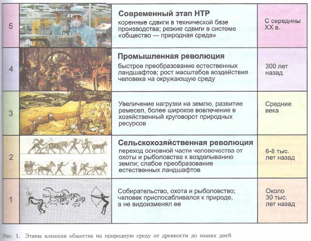 Начало освоения человеком планетыЧеловек — составная часть природы. Его дом — географическая оболочка Земли, сфера взаимопроникновения и взаимодействия литосферы, атмосферы, гидросферы и биосферы. В этом доме живет более 6 млрд человек. На каждого человека приходится более 2 га земной тверди, но примерно 1/3 суши — это малоприспособленные для жизни человека территории: пустыни и полупустыни, ледники зона многолетней мерзлоты, а есть еще и заболоченные пространства, высокие горы и т. д. В этой связи возникает закономерный вопрос: а сможет ли наша планета прокормить и напоить, обеспечить всем необходимым быстрорастущее население Земли? Ученые сходятся во мнении, что ресурсы планеты, если человечество будет их использовать по-хозяйски, способны удовлетворить потребности гораздо большего населения Земли, чем нынешнее. На протяжении истории человечества характер его связей с природной средой претерпевал большие изменения. В очень древние времена хозяйственная деятельность человека, которая заключалась в собирательстве, охоте и рыболовстве, приспосабливалась к природной среде, а не видоизменяла ее. Переход человечества от такого хозяйства, получившего название присваивающего, к производящему (земледелие и скотоводство) явился величайшей экономической революцией. Она привела к заметному усилению воздействия человека на природу (рис. 1).