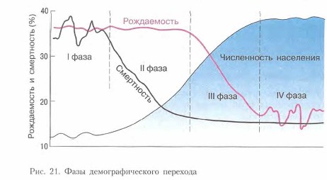 Для первой фазы характерна высокая смертность, компенсирующаяся высокой рождаемостью, что обеспечивает стабильную численность населения. На этой фазе человечество находилось почти всю свою историю, теперь она уже нигде не встречается. Вторая фаза характеризуется высокой рождаемостью и резко снизившейся в связи с успехами здравоохранения смертностью, следовательно, высоким естественным приростом. Именно в этой фазе произошел демографический взрыв. В этой фазе находятся некоторые страны Тропической Африки. Для третьей фазы характерна заметно снизившаяся рождаемость, которая все еще превосходит смертность, за счет чего население продолжает расти. В этой фазе находятся многие страны Азии и Латинской Америки. В перспективе должна наступить четвертая фаза, при которой показатели рождаемости и смертности зфавняются и рост населения стабилизируется. В действительности место на стыке третьей и четвертой фаз занимают развитые страны Запада, Япония, Китай, Россия и др. В отдельных странах наблюдается даже естественная убыль населения, так как низкая рождаемость не всегда покрывает смертность. Понятие «типы воспроизводства населения» как раз отражает соответствующие фазы демографического перехода. Так, первый тип воспроизводства населения, присущий наиболее отсталым странам Африки, Азии и Океании и характеризующийся очень высокой рождаемостью, уменьшением смертности и высокими темпами роста населения, отражает в основном вторую фазу демографического перехода. Второй тип, отличающийся средними и низкими показателями рождаемости, смертности и замедлением (или стабилизацией) темпов роста, соответствует третьей и четвертой фазам демографического перехода.