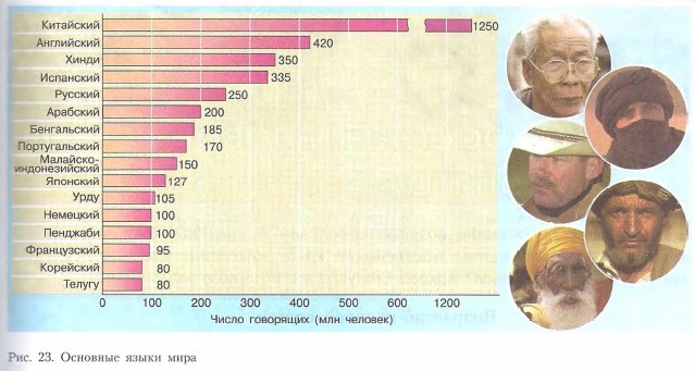 Однозначного совпадения языка и этноса нет. Так, норвежцы и датчане имеют общий язык, хотя представляют собой разные этносы. Англичане, американцы и австралийцы, будучи разными народами, говорят на английском языке. Вспомните об испаноязычных мексиканцах, чилийцах, колумбийцах, уругвайцах, аргентинцах и др. Вместе с тем встречаются случаи, когда, напротив, представители одного этноса разговаривают на разных языках (швейцарцы, канадцы). По оценкам ученых, в мире насчитывается примерно 5 тыс. языков, однако наиболее распространенных мало (рис. 23).