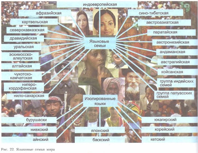 Языковой составЧаще всего при классификации народов предпочтение отдают языку как важному элементу человеческой культуры. Самая крупная единица языковой классификации — языковая семья (рис. 22), которая делится на языковые группы. Самая распространенная языковая семья — индоевропейская, которая объединяет 150 народов общей численностью около 3 млрд человек. Она включает несколько групп, из них самые многочисленные романская (французы, итальянцы, испанцы, португальцы, латиноамериканцы, румыны и др.), германская (немцы, англичане, американцы и др.), славянская (русские, украинцы, белорусы, поляки, чехи, словаки, сербы, хорваты, черногорцы, болгары и др.). Второй по численности является сино-тибетская семья, па языках которой говорит более 1 млрд человек, а крупнейшей языковой группой — китайская. Около 300 млн человек в мире говорит на языках семито-хамитской (афразийской) семьи (прежде всего арабы). Численность других языковых семей значительно меньше.