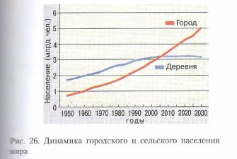 Города и урбанизацияГлавной формой расселения людей в современном мире становятся города (см. рисунок 26). Процесс урбанизации сопровождается ростом городов, увеличением доли городского населения, распространением городского образа жизни, повышением роли городов в жизни общества. Еще в 1800 г. в городах проживало лишь около 3% населения мира, а сегодня — уже около половины (в высокоразвитых странах доля горожан достигает 80% и более, в то время как в слаборазвитых — иногда не превышает 20—30%).