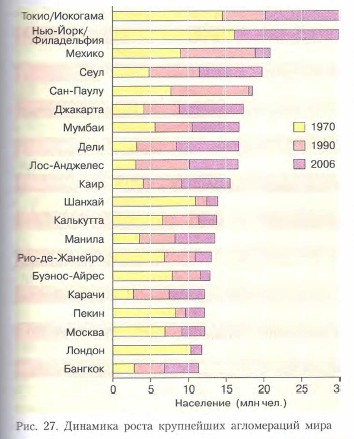 Близлежащие города и поселки зачастую сливаются, образуя агломерации. К числу крупнейших агломераций мира относятся Токио, Нью-Йорк—Филадельфия, Мехико, Сеул, Сан-Паулу и др. (см. рисунок 27). Гигантские скопления агломераций и городов, слившихся друг с другом, называют мегалополисами (от гр. megas — большой, polis — город). Крупный мегалополис сформировался вдоль Атлантического побережья США — от Бостона до Вашингтона (Босваш) с населением свыше 40 млн человек. Еще более крупный мегалополис сложился на Тихоокеанском побережье Японии с населением более 60 млн человек (включая Токио, Иокогаму, Кавасаки, Нагою, Киото, Осаку, Кобе и другие города).