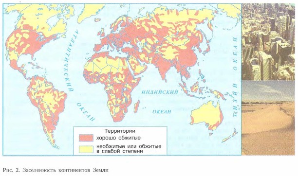Человек и ресурсы Земли § 2. Современное освоение планетыГде сегодня происходит хозяйственное освоение новых территорий? Чем отличаются культурные ландшафты от естественных? Как найти гармоничные основы взаимодействия общества и природы? Освоение новых территорий и акваторийПо имеющимся оценкам, в конце XX столетия площадь ойкумены занимала от 50 до 75% суши. Конечно, эти оценки весьма условны хотя бы потому, что многие не используемые человеком территории планеты испытывают на себе все возрастающий «пресс» атмосферных и гидросферных загрязнений. Таким образом, в мире остается еще немало слабо освоенных, по разным причинам не обжитых человеком территорий (рис. 2). Эти причины — недостаток солнечного тепла, многолетняя мерзлота, заболоченность, аридность климата, гористость, повышенная сейсмичность и т. д.