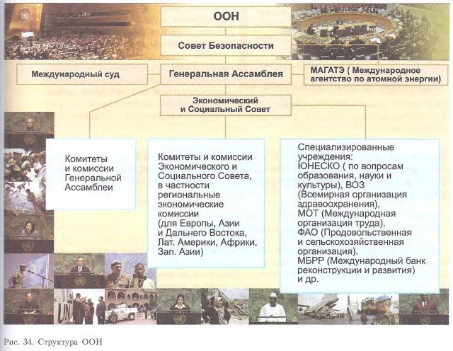 Политическая карта мира § 23. Политическая география и геополитикаПочему современный мир не отличается единой политической организацией? Что представляет собой политическая география? Каким образом геополитика связана с географией? Каково содержание евразийской идеи? Политическая организация мираМир, в котором мы живем, рассечен границами. Эти границы, межцивилизационные, государственные, политике-административные, экономические, этнические, конфессиональные, экологические и др., постепенно множатся и усложняются. То тут, то там возникают «горячие точки», вспыхивают межгосударственные, межнациональные, межрелигиозные, региональные конфликты. Нарушается баланс между различными государствами, блоками стран, регионами. Стремительно меняется политико-географическая картина мира — лишь на территории Евразии в результате распада СССР, бывших Югославии и Чехословакии возникло более 20 суверенных государств. Современный мир не отличается единой политической организацией. Существующая международная система, основанная на изменчивом соотношении сил государств, переживает серьезный кризис. Как известно, к началу XX в. международный порядок олицетворяли шесть-семь великих держав с их колониальными империями, сферами влияния и политическими союзами. Первая мировая война сильно поколебала этот порядок, но не устранила его. Версальская система оказалась несправедливой, а созданная державами-победителышцами Лига Наций — недолговечной. Определенные надежды на установление миропорядка были связаны с учреждением после Второй мировой войны Организации Объединенных Наций (рис. 34), однако возникновение НАТО и Организации Варшавского договора не оправдало этих надежд. После окончания периода «холодной войны» и распада СССР международная политическая система не стала более стабильной.