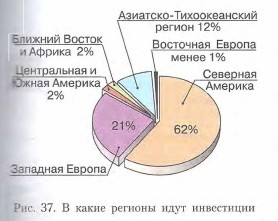 Рост советской экономики происходил преимущественно за счет выпуска средств производства, военной техники. Легкая и пищевая промышленность, сельское хозяйство были развиты слабо. Распад Советского Союза еще более обнажил недостатки российской экономики. Последовавший за этим глубокий экономический кризис подорвал экономический потенциал России и ее позиции в мировой экономике. Российский капитал стал «убегать» на Запад, «подкармливая» западные финансовые структуры. Рисунок 37 наглядно отражает лидирующую роль Северной Америки в привлечении капитала, в то время как Россия с ее примерно 1% «затерялась» в Азиатско-Тхоокеанском регионе.