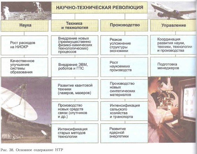 Основное содержание нынешней научно-технической революции (НТР) многообразно и имеет отношение ко всем ее составным частям: науке, технике и технологии, производству, управлению (рис. 38). Главной особенностью нынешнего этапа. НТР является бурное развитие науки, превращение ее в непосредственную производительную силу. Львиная доля расходов на научно-исследовательские и опытно-конструкторские разработки (НИОКР) в зарубежном мире приходится на США, Японию, Германию, Францию, Великобританию и КНР.