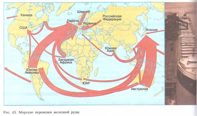 МеталлургияНесмотря на усиливающуюся конкуренцию пластмасс, алюминия, керамики, сталь остается пока основным конструкционным материалом. Темпы развития черной металлургии в ведущих странах мира на рубеже XX—XXI вв. замедлились, однако это практически не коснулось развивающихся стран, где развитие стимулировалось стремлением западных стран избавиться от экологически грязных производств. Существенно изменилась в последние десятилетия география мировой добычи железной руды. Использование богатой руды, добывающейся в странах, не входящих в мировую «элиту», привело к прекращению добычи в ряде железорудных бассейнов Западной Европы, а некоторые месторождения оказались исчерпанными. Основные производители и экспортеры железорудного сырья в мире — Бразилия, Индия, Венесуэла, Австралия, ЮАР, Либерия (рис. 45).