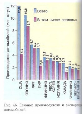Размещение мирового машиностроения обусловлено многочисленными факторами, действие которых в каждом конкретном случае определяется региональными условиями. Традиционно весьма важную роль играет трудовой фактор, подразумевающий трудоемкость отдельных машиностроительных производств, уровень квалификации занятых, наличие сети специальных научно-исследовательских организаций и лабораторий. Современное размещение машиностроения определяет также научно-технический прогресс, влияющий на внутриотраслевые сдвиги, на рост трудовых издержек в производстве продукции и на интеграцию новейших производств с научными центрами. Организация многих отраслей общего машиностроения (особенно тяжелого, в частности производств комплектного оборудования для новых предприятий) под силу лишь мощным индустриальным странам. Лишь страны «большой восьмерки» и Китай производят практически весь ассортимент продукции машиностроения. Что же касается транспортного машиностроения и электротехники, то сегодня не только развитые и новые индустриальные страны, но даже некоторые развивающиеся государства освоили (с помощью западных фирм) выпуск автомобилей (рис. 46), телевизоров, радиоприемников, микроволновых печей и т. п. На рубеже XX—XXI столетий особенно интенсивно машиностроение развивалось в Японии, Италии, Республике Корее, на Тайване, в Испании, Сингапуре, Бразилии, Мексике, Пуэрто-Рико, Китае.