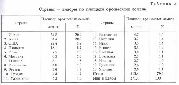 Значительная часть земледелия мира орошаемая. Это один из интенсивных видов земледелия, сложившихся преимущественно в засушливых регионах, недостаточно обеспеченных влагой в отдельные периоды вегетации. Крупнейшие в мире оросительные системы сложились в Китае, Индии, США (табл. 4). В некоторых странах (Кувейт, ОАЭ и др.) возможно лишь орошаемое земледелие.