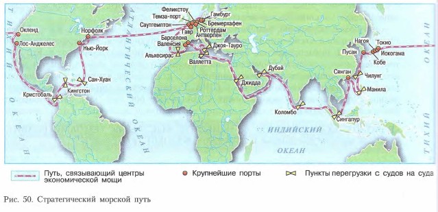 Великим путем мировой торговли издавна является Атлантический океан, пересекаемый важнейшими морскими дорогами. На обоих берегах Атлантики находятся такие крупнейшие порты мира, как Роттердам (Нидерланды), Нью-Орлеан (США), Марсель (Франция), Гамбург (Германия) и др. Выдвижение Японии, Китая и новых индустриальных стран Азии на мировую «авансцену» привело к стремительному росту грузооборота таких портов, как Шанхай (Китай), Кобе, Нагоя, Иокогама (Япония), Сингапур и др. (рис. 50).