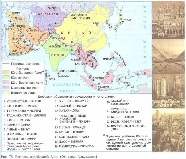 Регионы и страны Зарубежная АзияЭкономика и регионы зарубежной АзииАзия, в недалеком прошлом «аграрная периферия» мира, постепенно выходит на передовые позиции в экономике мира. Здесь расположены государства № 2 и № 3 современного мира по объему ВВП — Китай и Япония. При этом Китай — единственная крупная страна, продолжающая долгую, бескризисную фазу экономического развития. В Азии находится большинство стран новой индустриализации, имеющих высокие темпы экономического роста (Сингапур, Таиланд, Республика Корея, Малайзия, Индонезия). Экономика многих из них специализируется на выпуске наукоемкой и высокотехнологичной продукции. В условиях обострения глобальной энергетической проблемы наличие в Азии крупнейших нефтегазоносных провинций мира, расположенных в пределах Саудовской Аравии, Кувейта, Ирака, Ирана, ОАЭ, Бахрейна, Катара, Индонезии, Брунея и др., в состоянии окончательно склонить чашу весов в сфере экономики в пользу этой части света. Уже в настоящее время наблюдается тенденция переноса центра деловой (экономической и финансовой) активности мира с берегов Атлантики в Тихоокеанско-Азиатский регион. Вместе с тем в зарубежной Азии еще немало слаборазвитых государств (Афганистан, Лаос, Камбоджа и др.) с крайне низким уровнем ВВП на душу населения (1—3 тыс. долл.). Главными отраслями их экономики являются низкотоварное сельское хозяйство, горнодобывающая промышленность, ремесла. Обычно в зарубежной Азии выделяют Восточную, Южную, Юго-Восточную и Юго-Западную Азию (рис. 78). Рубежи между ними не всегда четки, поскольку границы как в природе, так и в обществе обычно условны. Так, страны Юго-Восточной Азии (государства Индокитая, Индонезия и др.), находясь под мощным влиянием древних цивилизаций Китая и Индии, испытывали «культурный пресс» как одной, так и другой стороны. Уже хотя бы поэтому культурные рубежи между Восточной, Юго-Восточной и Южной Азией не могут быть «стерильно» четкими.
