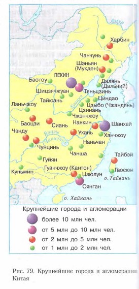 Китай все еще остается слабоурбанизированной страной (в городах живет меньше половины его жителей), однако число городов-миллионеров здесь, как ни в какой другой стране мира, около 50 (Шанхай, Пекин, Нанкин, Ухань, Харбин, Шеньян, Сиань, Гуанчжоу и др.; рис. 79).