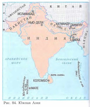 Регионы и страны § 48. Южная АзияКакие государства возникли в Южной Азии после распада Британской Индии? В чем особенности территории и природных условий? Что означает выражение «Индия в тисках демографического бума»? Каково место региона в мировом хозяйстве? Формирование политической карты региона. Природа и ресурсы Южной АзииЮжная Азия — это снежные вершины Гималаев и окаймленные кокосовыми пальмами лагуны островов Индийского океана; «затерянный мир» Кашмира, Непала, Бутана и многолюдье Колкаты, Мумбай, Карачи; современная индустрия бассейна реки Дамодар («индийский Рур») и примитивное земледелие бангладешских крестьян, упорным трудом осваивающих мангры. Это оплот индуизма, ислама, буддизма и все еще сохраняющееся кастовое деление, стык неповторимых культур и цивилизаций. До середины XX в. страны региона (за исключением Непала) были колониями Великобритании. Главными событиями в формировании современной политической карты Южной Азии стали обретение ими независимости и раздел бывшей Британской Индии на Индию и Пакистан. Последний состоял из двух территориально разобщенных частей — Западного Пакистана и Восточного. Позднее на месте Восточного Пакистана была провозглашена Республика Бангладеш. Разделение Индии на отдельные государства сопровождалось усилением религиозных распрей между индуистами и мусульманами, переселением многих миллионов людей, разрывом экономических и культзфпых связей, бесконечными пограничными спорами, сепаратизмом (стремлением ряда территорий выйти из состава государства). Наиболее острым остается до сих пор незатухающий спор Пакистана и Индии из-за Кашмира. По площади регион равен Западной Европе, а по численности населения более чем втрое превосходит ее. Широким фронтом Южная Азия выходит к Индийскому океану, через который проходят важные морские пути (рис. 84).