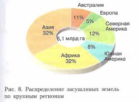 Наступают пески Сахары, растут пустыни Юго-Западной Азии, Северной и Южной Америки. При этом пустыни наступают на степи, степи — на саванны, саванны — на леса. Определенную роль в этом процессе играют циклические изменения климата, но главные причины — вырубка лесов, неправильная обработка полей (в частности, «перегрузка» их сельскохозяйственными культурами), перевыпас скота и т. д. На рисунке 8 показано распределение засушливых земель и пустынь по крупным регионам мира.