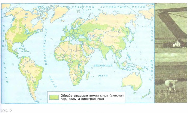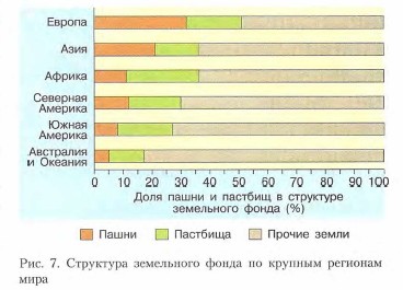 Доля сельскохозяйственных угодий сильно варьирует по странам. Так, в России она составляет 13% от ее площади, в Бразилии — 29%, Китае — 43%, США — 51%, во Франции и Индии — более 60%, и лишь Канада из крупных государств находится позади России по данному показателю — 8%. Основные причины подобных различий связаны с особенностями рельефа, термического режима, условиями влагообеспеченности, характером почвенного покрова. Различают две крупные категории сельскохозяйственных ландшафтов: земледельческие и пастбищные. Основные массивы земледельческих ландшафтов находятся в лесостепной и степной зонах умеренного пояса (Россия, Украина, США, Канада, страны Западной Европы и др.). Пастбищные ландшафты — это используемые для выпаса домашнего скота естественные и улучшенные пастбища, луга, предназначенные для заготовки сена, посевы культур для выпаса скота и леса, используемые для периодического или постоянного выпаса скота. Основные массивы пастбищных ландшафтов мира сосредоточены в Австралии, Китае, США, странах Центральной Азии, Монголии, Бразилии и Аргентине и приурочены главным образом к зонам сухих степей, саванн, редколесий, тундр и полупустынь. Хотя пастбищные земли более чем в два раза превышают площадь пашни (причем эта пропорция с каждым годом изменяется в пользу пастбищ за счет лесов и низкопродуктивных пашен), они дают лишь около 10% сельскохозяйственной продукции. На рисунке 7 видно, что наиболее высоким уровнем освоенности земель отличаются страны Европы, а сравнительно низкий уровень освоенности земель в Африке, Австралии и Южной Америке.