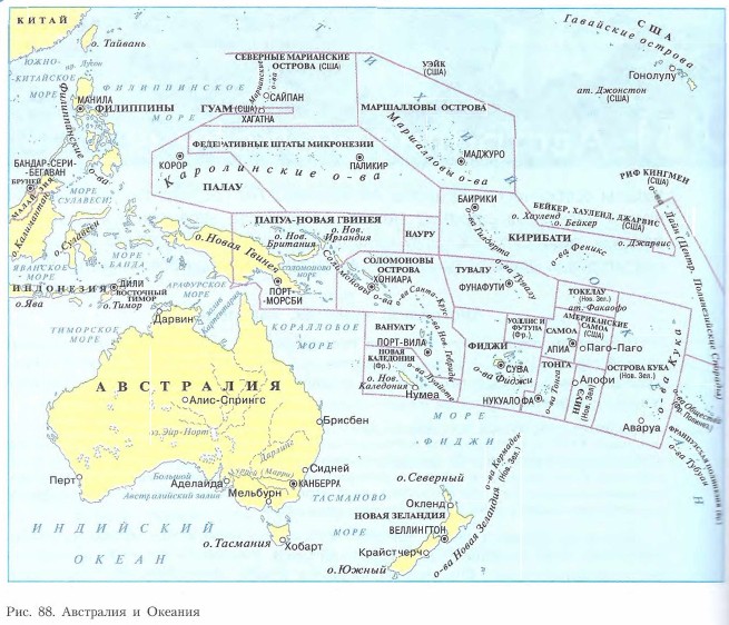 Регионы и страны § 51. Австралия и ОкеанияКаковы особенности природы Австралии? Где сосредоточена большая часть населения страны? Почему Австралия, экспортируя сырьевые ресурсы, относится к числу наиболее развитых государств мира? Какая отрасль экономики является основной для жителей Океании? Австралия: природа, населениеВ прошлом Австралия — владение Великобритании и заселялась переселенцами из этой страны. Ныне — член Содружества, возглавляемого Великобританией. Официально главой государства считается английская королева, которую представляет генерал-губернатор. Австралия была открыта европейцами в начале XVII в., но ее освоение и заселение начались только в конце XVIII в., причем сначала Австралия была местом ссылки преступников из Англии. Так, в 1788 г. на месте современного Сиднея была основана первая колония каторжников, позже группы каторжников были высажены в районах современных крупнейших городов континента — Мельбурна, Аделаиды, на острове Тасмания и т. д. Лишь после открытия богатых месторождений золота в Австралию из Европы хлынул поток законопослушных иммигрантов. Австралия занимает целый материк, остров Тасманию и ряд мелких островов. Официальное ее название — Австралийский Союз, которое указывает на федеративное устройство страны. Она состоит из шести штатов, двух отдельных территорий, кроме того, столица Канберра образует особую административную единицу.