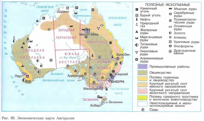 Ключевая роль в хозяйстве страны принадлежит горнодобывающей промышленности и сельскому хозяйству (рис. 89), что отличает Австралию от других развитых стран и сближает с Канадой. По добыче ряда металлических руд (железной руды, цинка, свинца) Австралия занимает передовые места в мире. Ее пример показывает, что сырьевая специализация — это еще не признак отсталости. Важно, что Австралия обладает высокоразвитыми отраслями обрабатывающей промышленности (автомобилестроение, электроника и электротехника, выпуск агротехники и т. д.), продукция которых по стоимости превосходит продукцию добывающей. «Столицей» всей горнозаводской промышленности является город Брокен-Хилл, расположенный на юго- востоке страны. Новые районы добывающей промышленности — Север и Запад. Спецификой Австралии является сильно развитая пищевая (особенно мясная) промышленность, в значительной степени работающая на экспорт.