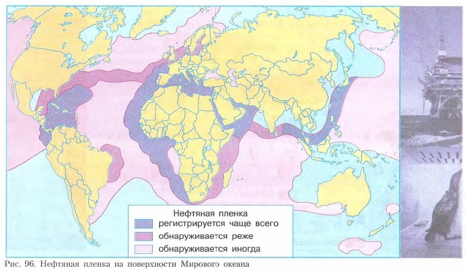 Глобальные проблемы человечества Экологическая проблемаВ центре внимания ученых в последние десятилетия еще одна экологическая опасность — разрушение озонового слоя Земли, который защищает планету от губительного ультрафиолетового излучения Солнца. Есть мнение, что причина разрушения озонового слоя — резко возросшее производство и использование так называемых фреонов в холодильных установках, в виде аэрозолей и т. д. Интенсивная хозяйственная деятельность привела к сильному загрязнению Мирового океана. В него ежегодно попадает более 1 млн т нефти (катастрофы танкеров и буровых платформ, слив загрязненных нефтью вод с судов, потери на морских нефтепромыслах, отходы промышленности и городов, в том числе тяжелые металлы и даже радиоактивные отходы в контейнерах. Особо загрязнены окраинные моря Мирового океана — Северное, Балтийское, Средиземное, Черное, Азовское, заливы Персидский, Мексиканский (рис. 96). Загрязнение привело к сокращению биологической продуктивности Океана.