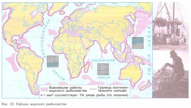 В Мировом океане, как и на суше, есть высокопродуктивные и малопродуктивные площади. Как вы видите по рисунку 15, рыбный промысел ведется преимущественно в районах материковой отмели и мелководных банок. В пределах мелководий много солнечного света и органического вещества. Именно здесь сосредоточены основные очаги органической жизни в Мировом океане, или, по В. И. Вернадскому, сгущения жизни.