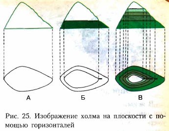 Представьте, что перед нами холм. Обходим этот холм, строго придерживаясь одной абсолютной высоты. Изображаем на плане свой путь. У нас получится план холма — очертание того места, которое он занимает (рис. 25, А). Поднимемся на 5 м по вертикали вверх. Придерживаясь этой высоты, снова обойдём холм кругом. Снова изобразим план пути. У нас получится вторая горизонтальная линия, опоясывающая холм на высоте 5 м от его подошвы (рис. 25, Б). Поднявшись ещё на 5 м и в третий раз обойдя холм, мы сможем изобразить третью линию уже на высоте 10 м от подошвы. Точно так же, ещё дважды поднимаясь каждый раз на 5 м, мы проведём две линии: на высоте 15 м и на высоте 20 м от подошвы (рис. 25, В). Далее до вершины остаётся 4м — значит, следующую линию провести нельзя. Можно подсчитать относительную высоту холма: 24 м.