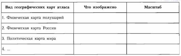 Откройте атлас 1. Изучите свой школьный атлас. Опишите виды географических карт, заполнив таблицу в тетради.
