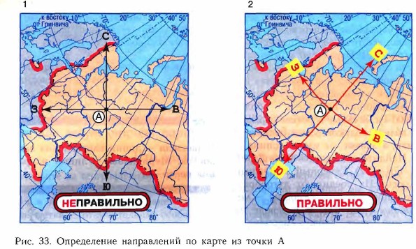 План и карта Градусная сеткаГлавное, необходимо помнить, что определять направления на карте следует по меридианам и параллелям (рис. 33).