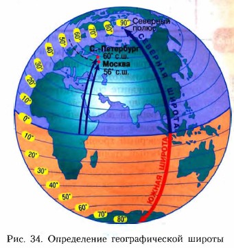 Для того чтобы узнать широту заданной точки, нужно найти параллель, на которой она расположена. Отсчёт начинаем от экватора, следуя строго вдоль меридиана на север или на юг (рис. 34). Все точки экватора имеют нулевую широту. Расстояние от экватора до полюса 90°. Чем больше мы будем удаляться от экватора, тем больше будет градусное расстояние до нужной нам параллели, тем больше будет её широта. Поэтому широты в полярных областях так и называются — высокие, а вблизи экватора — низкие.