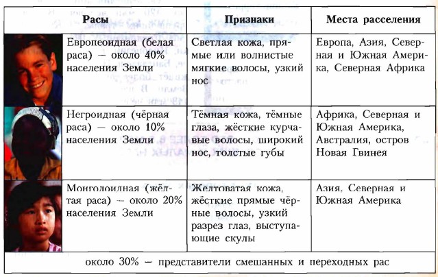 Человек на Земле § 18. Расы и народыКакого цвета население Земли. Сколько людей на Земле. Как люди разместились на Земле. В каких странах и городах живут люди. Какого цвета население ЗемлиВы, конечно, знаете, что люди бывают с разным цветом кожи. На Земле существует три основные расы — европеоидная, монголоидная, негроидная. Есть также много смешанных и переходных типов. Внешние признаки, по которым одна группа людей отличается от другой, называются расовыми (см. таблицу). Точная причина расовых различий ещё не выяснена. Одни учёные предполагают, что на Земле было несколько очагов зарождения человека и расовые признаки передавались по наследству. Другие считают, что люди, расселяясь по Земле, приспосабливались к разным природным условиям. Поэтому, например, у жителей Африки (негроидов) чёрная кожа не обгорает на Солнце, курчавые волосы предохраняют голову от перегрева, а толстые губы увеличивают испарение, охлаждая организм.