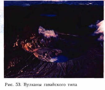 А вулканы, например, Гавайских островов (рис. 53) извергаются без взрывов. Их кратеры заполнены жидкой лавой, которая, переливаясь через край, стекает по склонам конуса. У таких вулканов более пологие склоны, а в кратерах даже могут образоваться лавовые озёра.