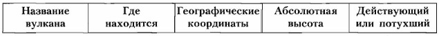 Откройте атлас 1. На карте (рис. 50) найдите вулканы: Ключевская Сопка, Этна, Фудзияма, Везувий, Гекла, Кракатау, Орисаба, Килиманджаро, Котопахи. 2. Почему происходят извержения вулканов? Это я знаю 3. В чём сходство и различие между землетрясениями и вулканизмом? 4. Гейзер — это горячий источник, периодически выбрасывающий из недр: а) грязевые потоки; б) горячую воду и пар; в) газы и пепел. Это я могу 5. На контурной карте отметьте вулканы, указанные в тексте учебника. Что общего у районов распространения землетрясений и вулканов? 6. Опишите вулканы Ключевская Сопка, Эльбрус, Везувий, Этна, заполнив в тетради таблицу.