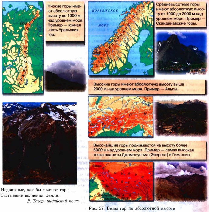 В отличие от равнин горы — самые неровные участки земной поверхности. Если на равнинах колебания относительной высоты составляют не более 200 м, то в горах перепад высот гораздо больше — от сотен метров до нескольких километров. Горы различаются между собой по высоте (рис. 57).