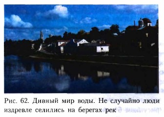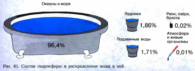 Гидросфера включает в себя солёные воды океанов и морей, пресные и солёные воды суши и воду, содержащуюся в атмосфере и в живых организмах. К водам суши относят поверхностные воды (реки, озёра, болота), ледники и подземные воды. Рассмотрите рисунок 61. Вы видите, что 96,4% воды в гидросфере — это вода океанов и морей. Остальное приходится в основном на воды суши. Среди вод суши наибольший объём имеют ледники и подземные воды — 1,86% и 1,71% от объёма гидросферы. Реки, озёра и болота, иногда огромные по площади, все вместе — это менее 0,02% от объёма воды в гидросфере. В атмосфере и в живых организмах содержится менее 0,01% всей воды гидросферы, но роль её огромна. Подавляющая часть воды в гидросфере содержится в жидком виде — более 98%. Твёрдая вода (лёд или снег) составляет менее 2% массы гидросферы, а газообразная (водяные пары) — всего доли процента.