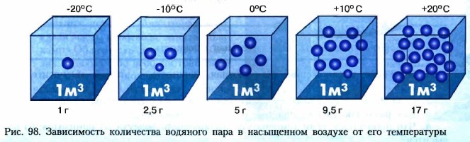 Какой воздух влажный, а какой — сухойКоличество водяного пара, которое может содержаться в воздухе, зависит от его температуры. Например, 1 м3 холодного воздуха при температуре около -10 °С может содержать максимально 2,5 г водяного пара. Но 1 м3 воздуха при температуре +20 °С может вместить до 17 г водяного пара (рис. 98).