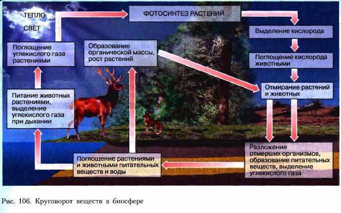 Биосфера — живая оболочка Земли Биосфера — земная оболочкаКак происходит круговорот веществ в биосфереЖивые организмы на Земле тесно взаимосвязаны. Растения поглощают солнечную энергию и преобразуют её в органические вещества — «тело» растений (их стебли, листья, корни и др.). Эта растительная масса служит кормом для травоядных животных. А их, в свою очередь, поедают хищники. Отмершие растения и погибшие животные попадают в землю (или на морское дно), часть из них перерабатывается микроорганизмами и превращается на суше в перегной (гумус) — главную составляющую плодородия почвы. А на этой почве, в свою очередь, снова вырастут растения, их съедят травоядные животные и т. д. — так происходит круговорот веществ в биосфере (рис. 106). Другая часть отмерших животных и растений в течение длительного времени превращается в осадочные горные породы — так образуются известняк, мел, уголь, коралловые острова.