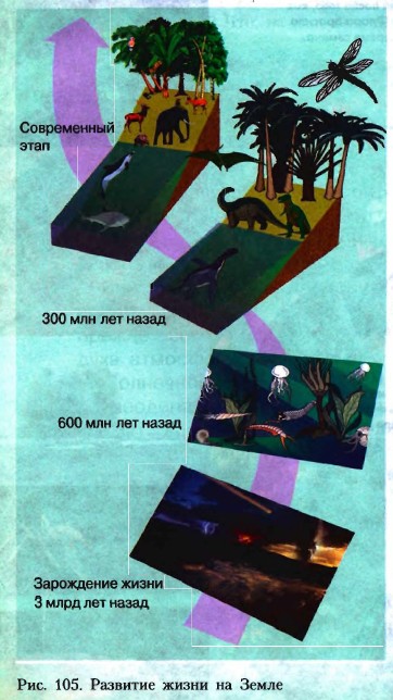 Биосфера возникла гораздо позже, чем другие земные оболочки. Более 3 млрд лет назад (возможно, и раньше) на нашей Земле в древнем Океане зародились простейшие микроорганизмы и одноклеточные водоросли, затем появились более сложные организмы. Постепенно растения и животные вышли на сушу (рис. 105). Около 40 тыс. лет назад появился Человек разумный. Прошли сотни миллионов лет, прежде чем в процессе эволюции сформировался тот разнообразный органический мир, который сегодня существует на Земле. Живые организмы распространены очень широко — от верхних слоёв тропосферы (птицы, переносимые ветром микроорганизмы) до глубин Океана (глубоководные рыбы) и земных глубин в несколько километров (микроорганизмы, способные существовать без воздуха). Нынешний состав атмосферы — результат многовековой работы растений. Поглощая солнечный свет и углекислый газ, растения вырабатывают органические вещества и выделяют в атмосферу кислород. Живые организмы на Земле исключительно разнообразны. Учёные лишь приблизительно подсчитали, что их больше 2,5 млн видов. Все вместе они образуют органический мир нашей планеты. Из общего числа видов организмов 21% приходится на растения, но по своей массе они почти в 100 раз превосходят массу животных. Большинство растений малоподвижны, надолго прикреплены к одному месту. Животные же, напротив, подвижны — большинство активно передвигаются по суше, воде и в воздухе. Чем проще устроен организм, тем шире он распространён на нашей планете. Например, среди всех живых существ (кроме бактерий) преобладают насекомые. Среди животных всего 4% позвоночных, из которых лишь десятая часть — млекопитающие, в том числе и человек.