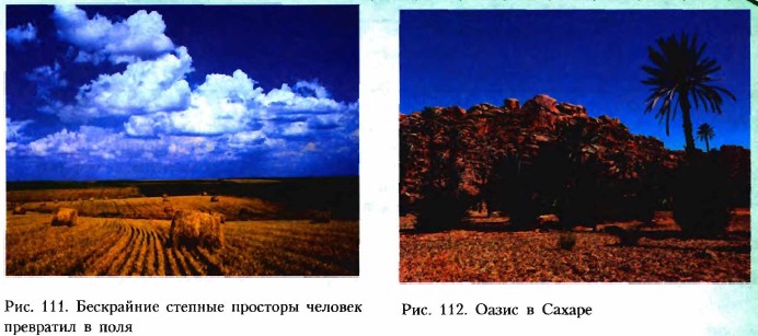 Биосфера — живая оболочка Земли Биосфера — сфера жизниКак человек изменяет биосферуБиосфера более уязвима для человеческого воздействия, чем другие оболочки. Более того, взаимосвязи в ней гораздо сложнее. Из истории Древней Греции вы знаете, что сельское хозяйство там было представлено выращиванием зерновых, оливок и разведением коз. Население Греции росло, требовалось всё больше продуктов питания. Стада коз становились всё больше, им не хватало уже традиционных пастбищ. Козы забирались всё выше и выше в горы, поедали там не только всю траву, но и листья деревьев и кустарников. Деревья и кустарники погибали, выщипанная полностью трава не восстанавливалась. Горы, лишённые растительного покрова, становятся беззащитными перед эрозией — смывом почвенного слоя дождями. А когда почвы смыты, на склонах гор ничего не растёт, и там, где были пастбища, теперь только голые скалы. Когда горы были покрыты растительностью, она задерживала своими корнями влагу. С гор текли ручьи, которые питали реки на равнине. А если дождевая вода не задерживается в горах, а сразу стекает на равнину (смывая всё на своём пути), то и ручьи исчезают, а с ними пересыхают и реки. И вся плодородная равнина тоже страдает от засухи! Множество подобных историй должно было произойти, чтобы люди наконец поняли, что в природе (особенно в биосфере!) «всё связано со всем». Изменяя один компонент природы, надо представлять себе, как это скажется на всех остальных компонентах. К счастью, человек не только портит биосферу. Во многих случаях он её и улучшает. Например, по указу царя Петра I в разных районах России была организована посадка деревьев для последующего строительства кораблей, а во многих уже существующих лесах была запрещена рубка леса. Пётр I очень жестоко обходился с нарушителями: их наказывали батогами и ссылали на каторгу, а то и казнили. Ещё больше примеров улучшения человеком природы в засушливых районах, особенно в пустынях. Используя грунтовые воды или оросительные каналы, люди превратили многие участки пустыни в оазисы, где и урожаи собирают неплохие, и условия жизни человека гораздо лучше.