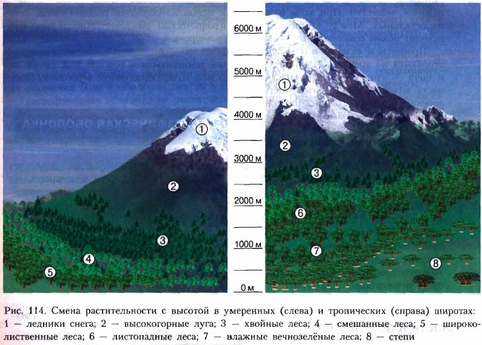 Различия в тепле и влаге создают на разных широтах разные условия для живых организмов. В результате на равнинах суши чередуются лесные и безлесные зоны. Например, большинство жителей России живут в умеренных широтах, где наиболее широко распространены леса. Здесь достаточно для них и осадков, и тепла. Ближе к полюсам, в высоких широтах, тепла для деревьев уже не хватает, и на смену лесам приходят тундры. Напротив, в более низких широтах, в центральных частях материков, тепла гораздо больше, но деревьям недостаточно воды. Здесь располагаются степи и пустыни. В экваториальных широтах очень тепло, давление понижено, количество атмосферных осадков велико: здесь опять господствуют леса. По карте природных зон (с. 188—189) проследите, как от экватора к полюсам сменяются зональные природные комплексы природные зоны. Однако на одной и той же широте на суше неодинаково сочетание тепла и влаги, т. е. могут быть влажные прибрежные районы и внутренние сухие, защищённые горами или открытые всем ветрам. Природные зоны — зональные комплексы — сочетаются с азональными (незональными). Азональные природные комплексы бывают крупные (материки и их части, океаны) и мелкие. Чаще всего они зависят от строения рельефа территории и образуются из-за различий в свойствах горных пород. Например, на материке Африка или на Восточно-Европейской равнине сменяются несколько природных зон, а оазис — малый азональный комплекс внутри природной зоны пустынь. Азональными природными комплексами являются и высотные пояса. Природные комплексы закономерно сменяются не только от экватора к полюсам, но и в горах — от подножия к вершине. Это хорошо заметно по изменению растительности с высотой (рис. 114). Поднимаясь всё выше в горы, мы попадаем во всё более холодные условия — как если бы по равнине мы продвигались в сторону полюсов. Высотная поясность существует в горах любой природной зоны. Чем дальше от экватора удалены горы, тем меньше у них набор высотных поясов.