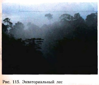 Влажные экваториальные леса располагаются по обе стороны от экватора. Здесь нет времён года. Круглый год очень тепло — от 24 до 28 °С и влажно (свыше 2000 мм осадков в год). Растительность образует несколько ярусов. В кронах деревьев живут обезьяны, множество птиц, по земле ползают змеи и ящерицы. В многоводных реках водятся крокодилы, бегемоты. Особенно разнообразен мир насекомых. Некоторые опасны для человека, поскольку являются переносчиками болезней — малярии, жёлтой лихорадки. Такого разнообразия растительности и животного мира нигде на Земле больше не встречается (рис. 115).